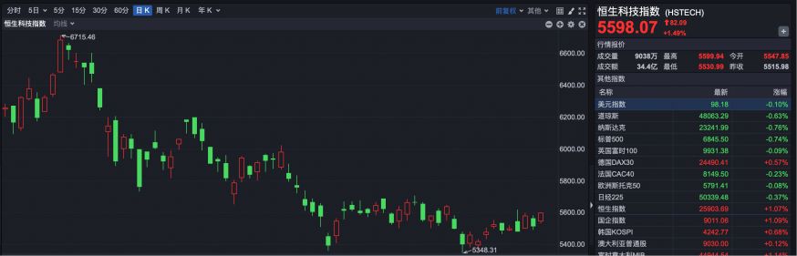 恒生科技指数报5598.07点,涨幅1.48%。